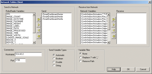 1. Connection - Specify the hostname and port for the network tables server. Note that the IP address is typically 10.X.Y.2 where X and Y are created